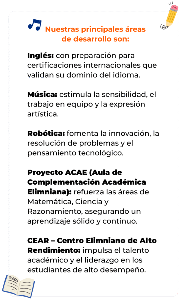 En el Colegio Internacional Elim Villa El Salvador, acompañamos a nuestros adolescentes en una etapa decisiva de crecimiento personal y académico. Nuestra misión es guiarlos para que descubran su vocación, afiancen su identidad cristiana y desarrollen las competencias necesarias para afrontar con éxito los desafíos del futuro.